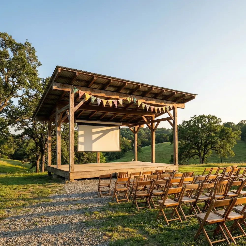 An outdoor pavilion surrounded by nature, perfect for community gatherings and open-air performances.